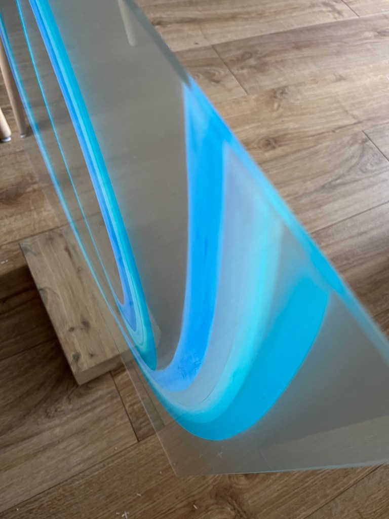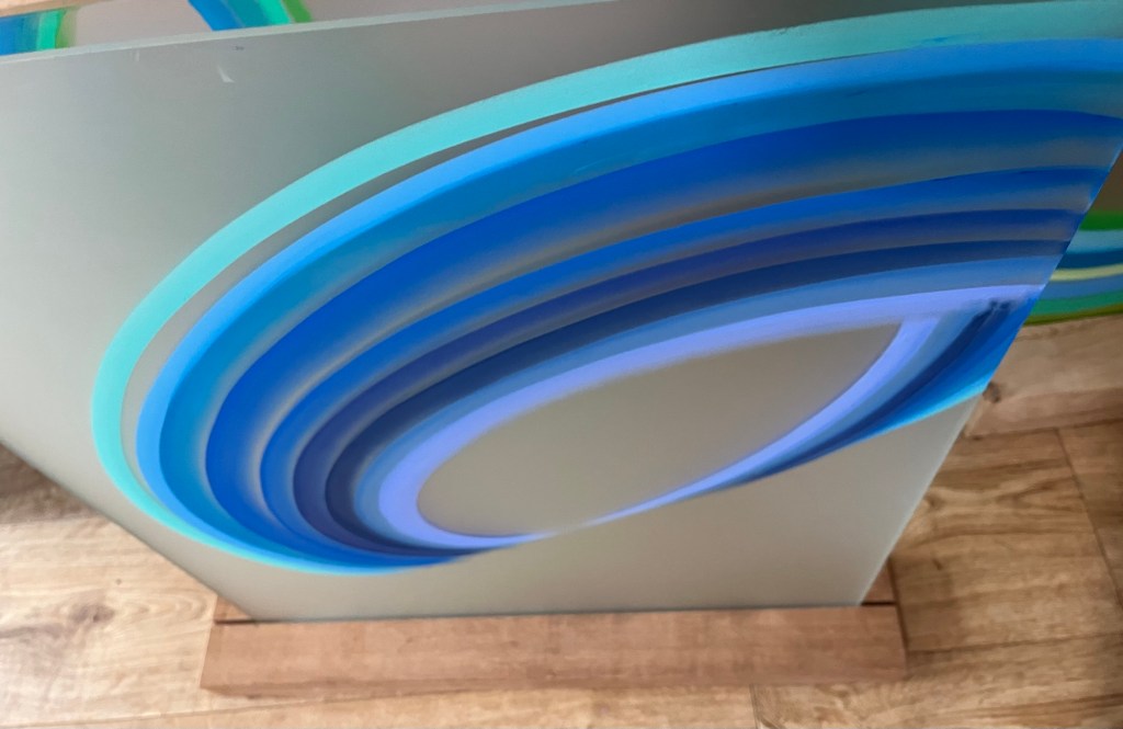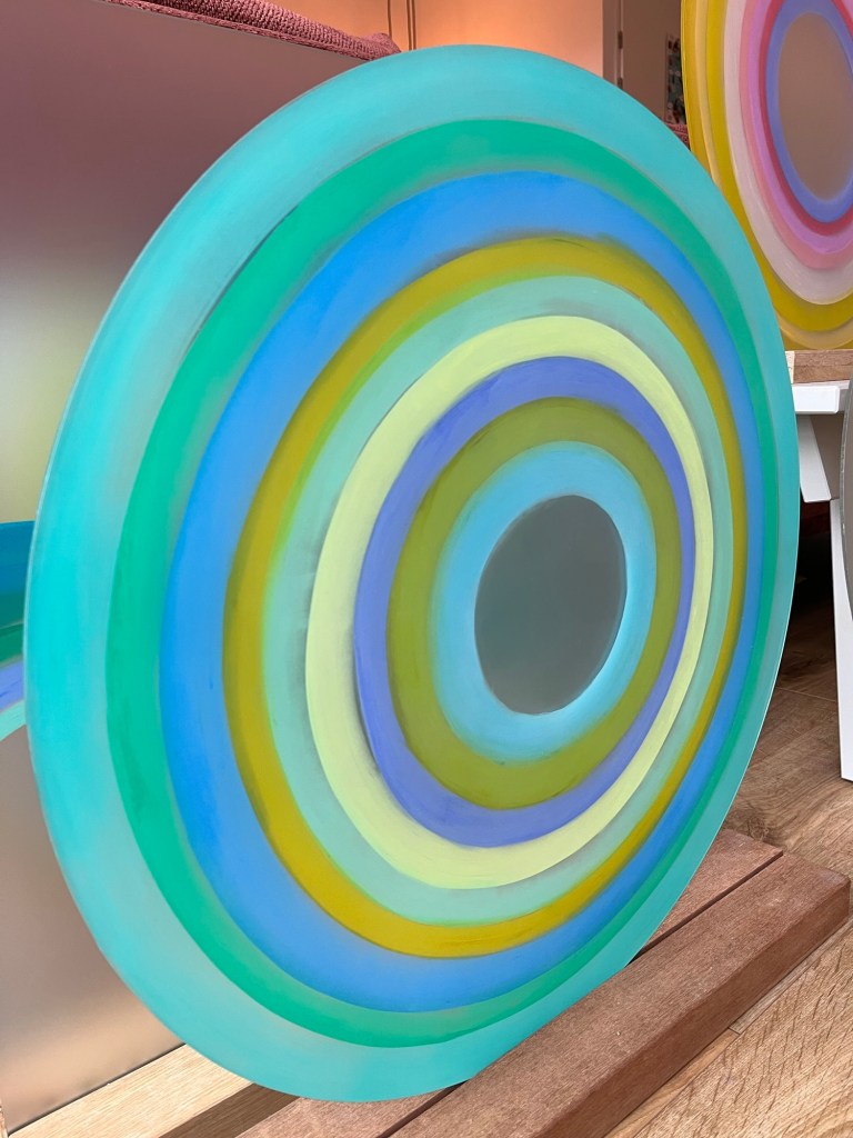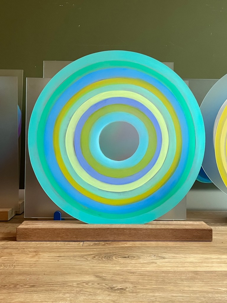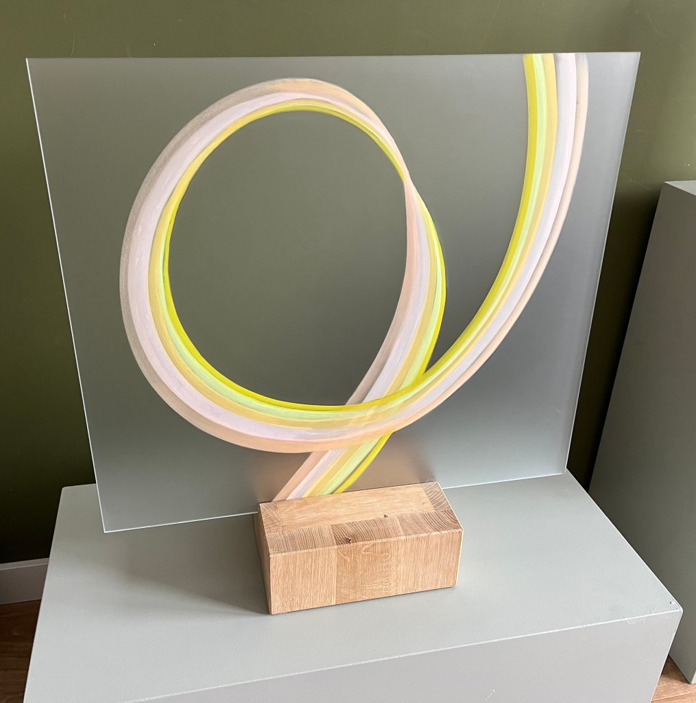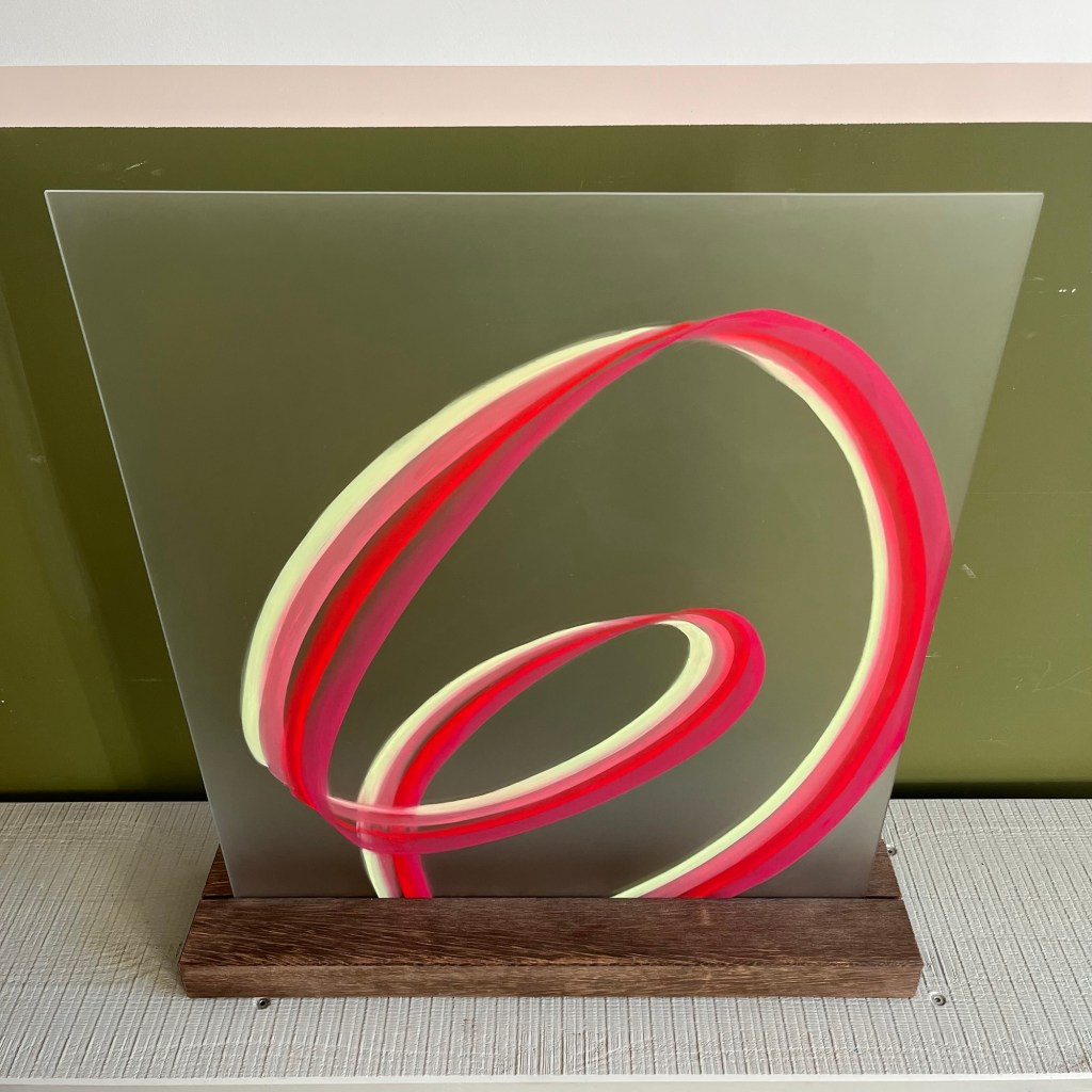 July 2025 Material: Neopastel on satin glass. Size glass: 60 cm diameter, including standard 62,5x60x12,5 (hxwxd)
