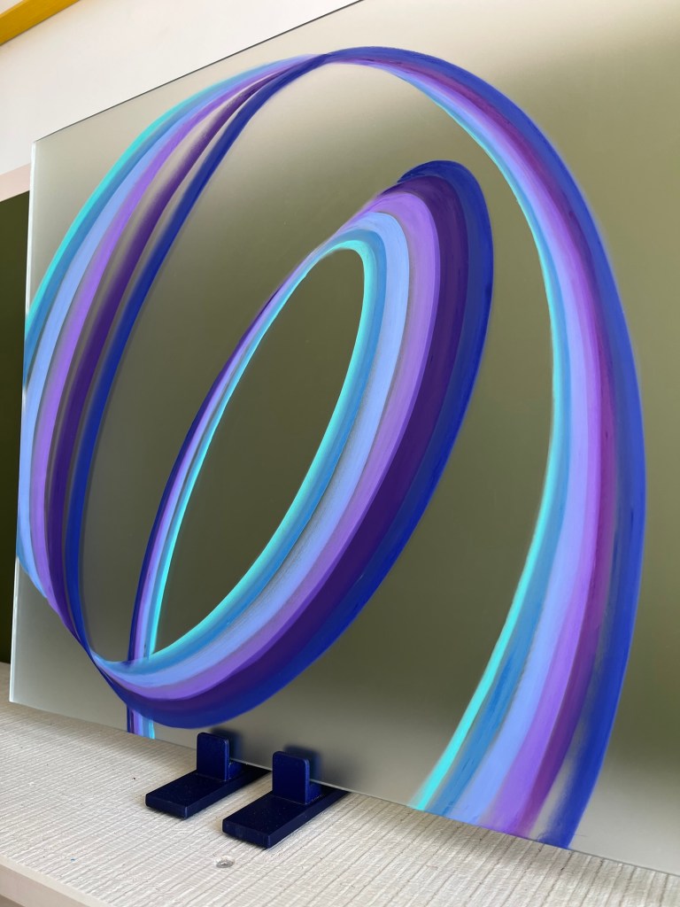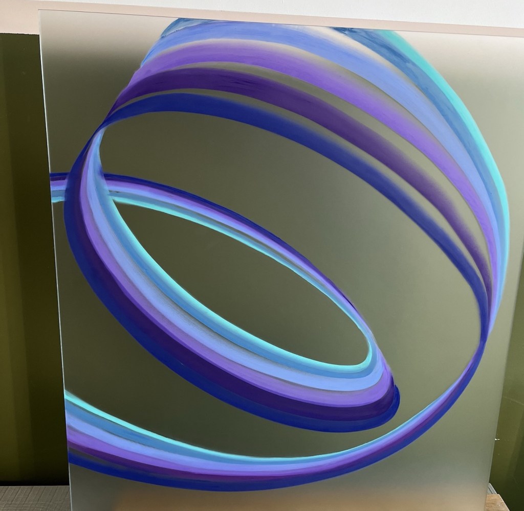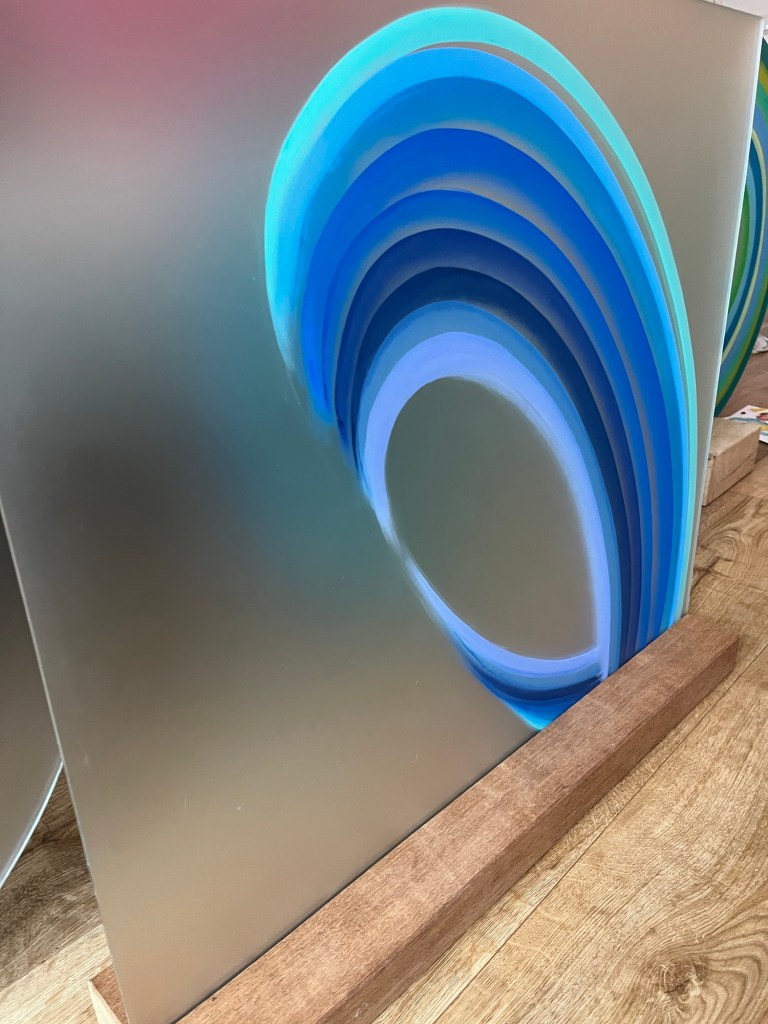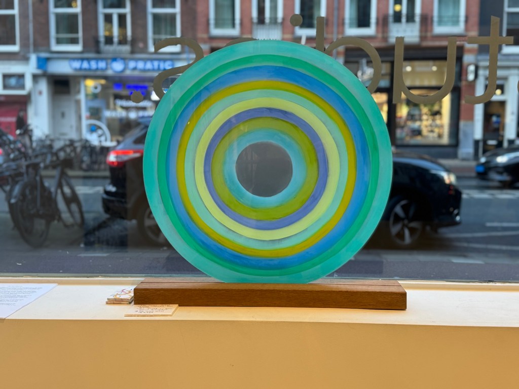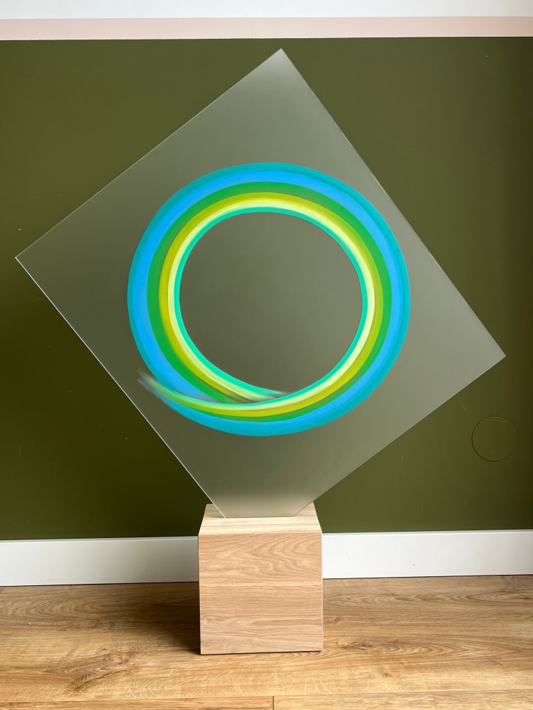 This painting was created out of the urge to paint not just round on round. From the moment I discovered the round glass I immediately felt the need to paint squares on a round. I started of not centred but a bit more to the side. Thats’s how this painting was started. Out of the box in so many ways. You can discover in this artwork multiple shifts of perspective.