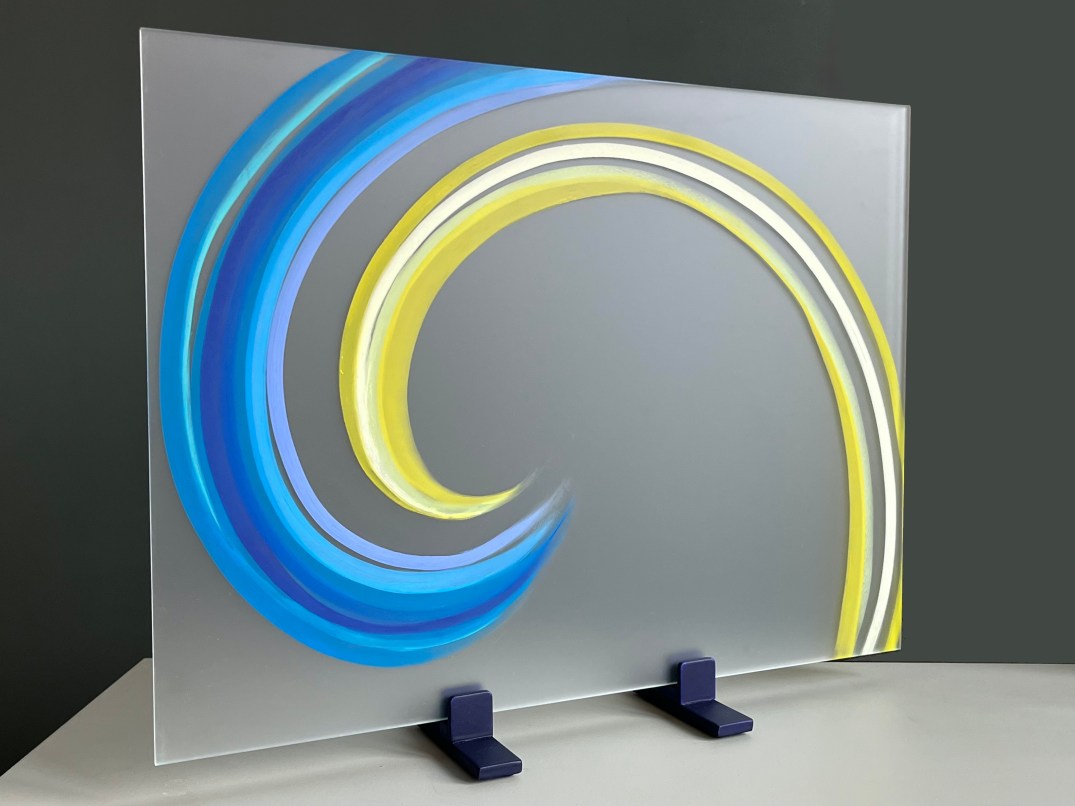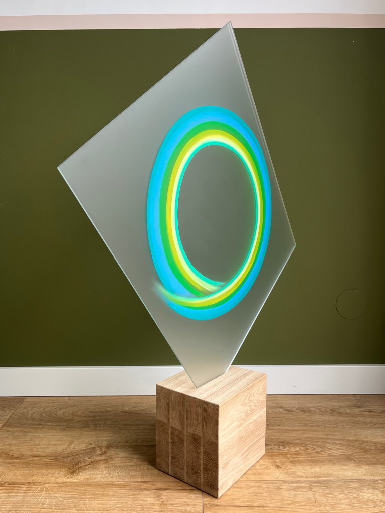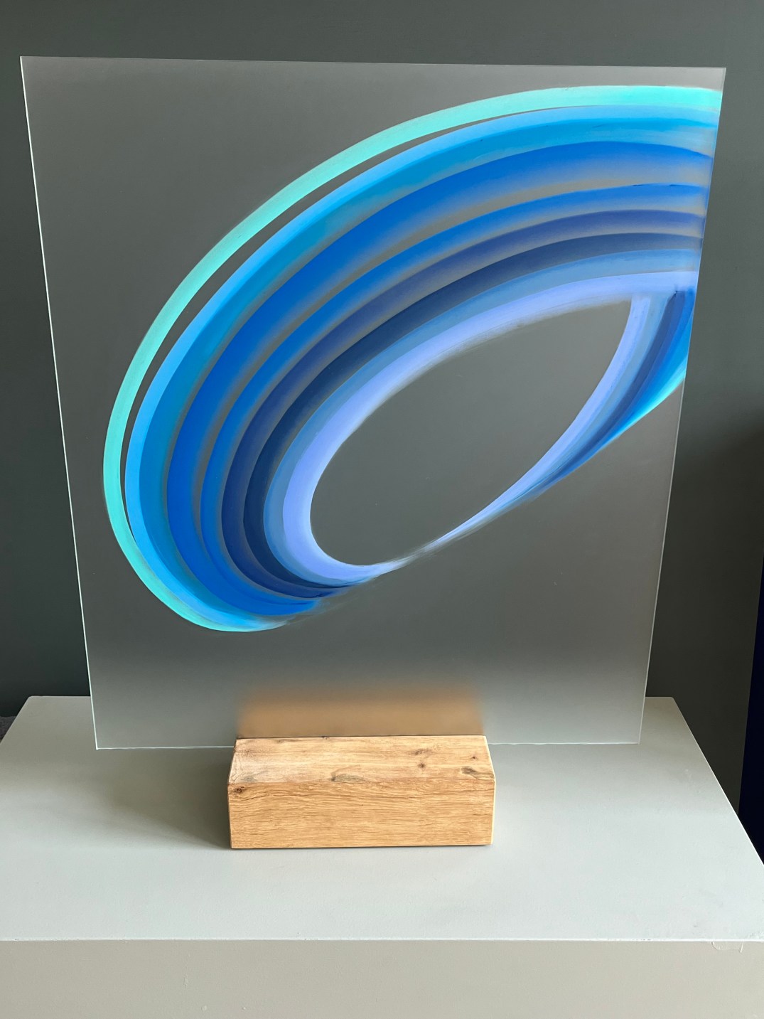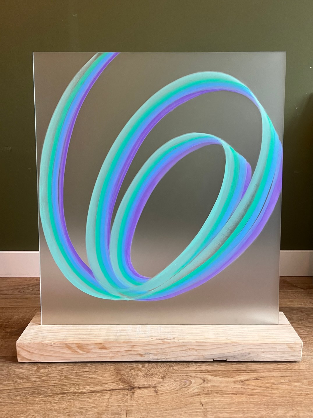 Belonging to the serie mesmerizing the colour effect is really optical. What happens to a painting when you can walk around it? Discover it from all sides? It is almost liberated from gravity? How close can we get to being liberated, that is what this painting is about. The glass is almost liberated from the standard as well.