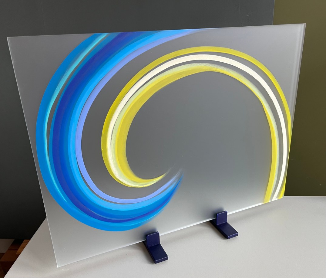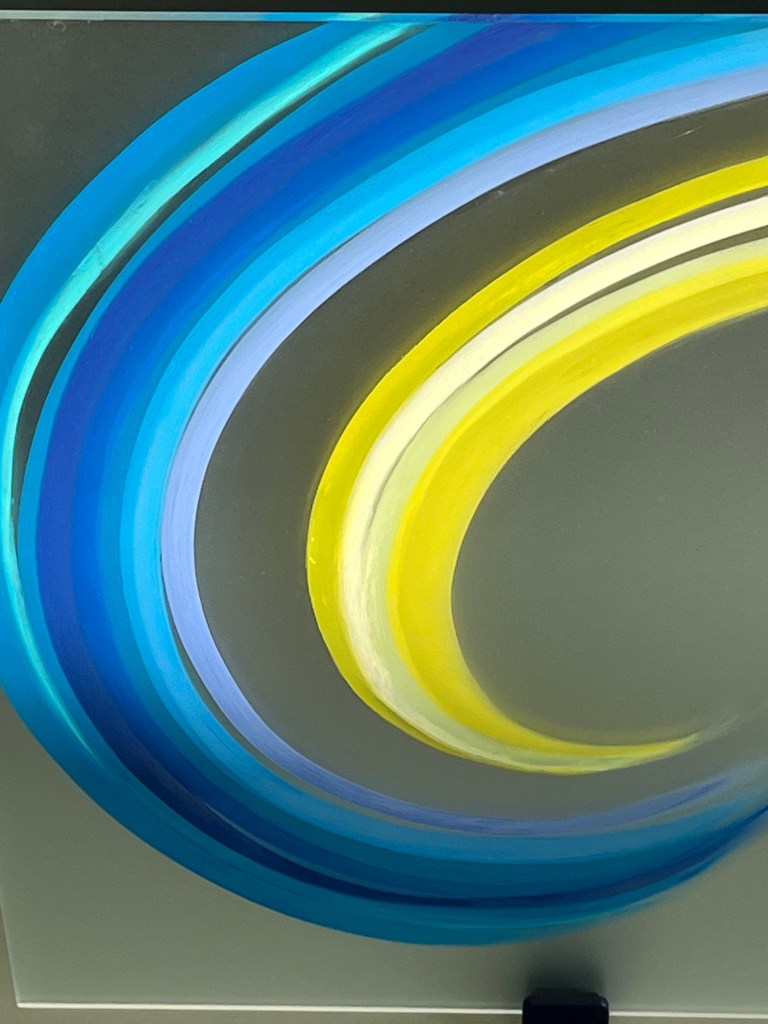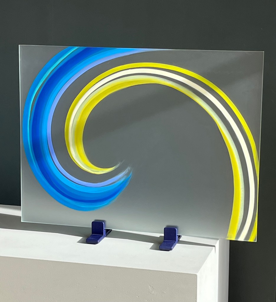 What if the wind takes shape? If it regains it’s speed from far away. What would it’s movement be like then? What if the wind is changing it’s direction half way and starts to play. The paintings colours are really soft, as soft as a breeze of air. It can be the wind you feel just sitting outside or on a bigger scale, the higher winds up in the air. Due to the transparancy of the glass the colours meet a transparency as well.