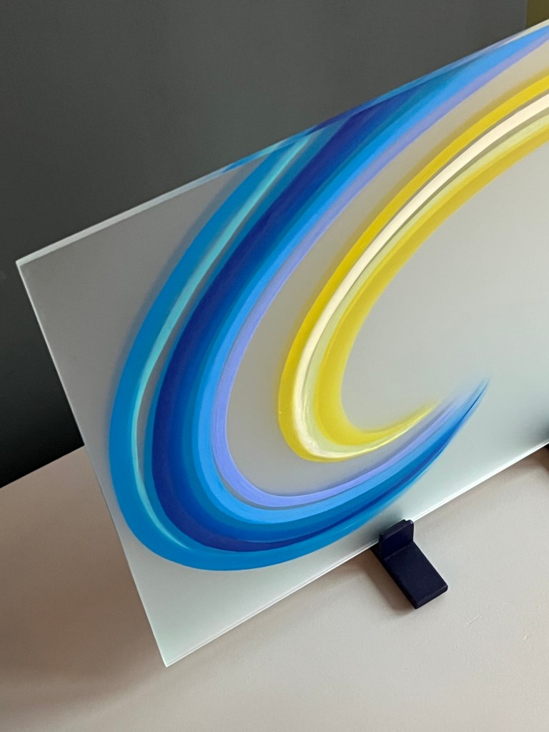 Movement Of The Wind; What if the wind takes shape? If it regains it’s speed from far away. What would it’s movement be like then? What if the wind is changing it’s direction half way and starts to play. The paintings colours are really soft, as soft as a breeze of air. It can be the wind you feel just sitting outside or on a bigger scale, the higher winds up in the air. Due to the transparancy of the glass the colours meet a transparency as well.