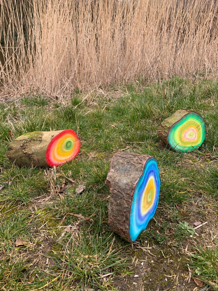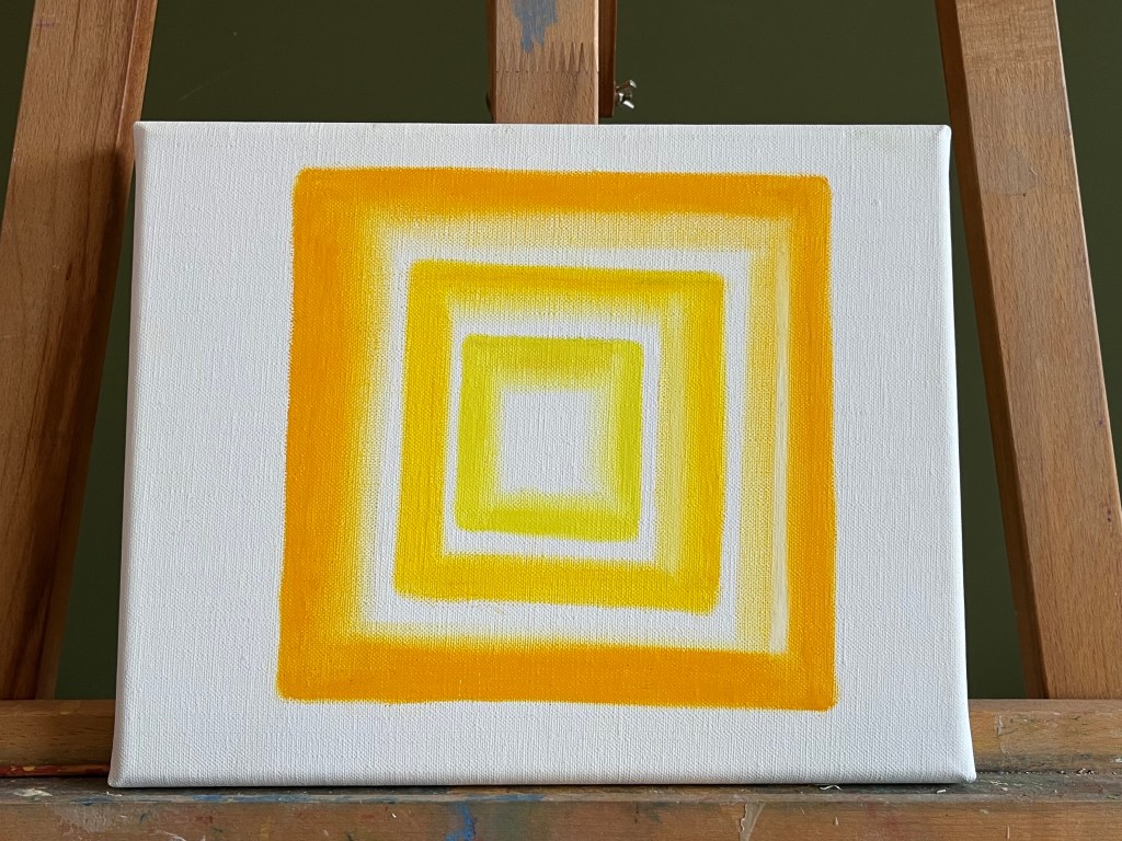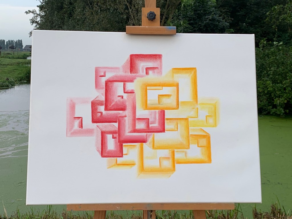 Based on a flower which had 2 sides of colour. And turning round and round in the flowering proces, day after day opening more and more. This painting is actually four paintings in one. Being able to turn it, and look at it from all the perspectives just as the dahlia flower.